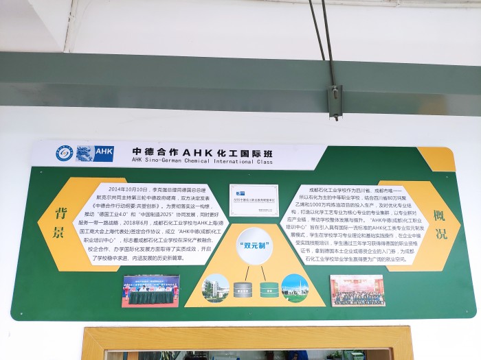 该科AHK化工国际班教室文化建设紧紧围绕德国“双元制”职业教育本土化的创新理念,结合学校成立AHK中德(成都)化工职业培训中心的背景、概况,化工及相关知名企业高端就业前景,AHK化工工艺员职业资格考试信息介绍,三年学习周计划等方面内容进行设计,充分体现了AHK化工国际班的办学特色。