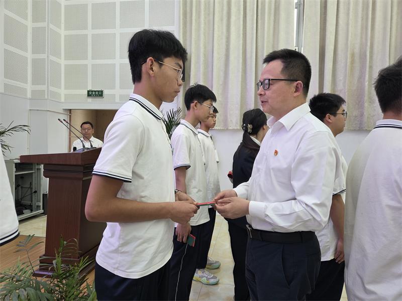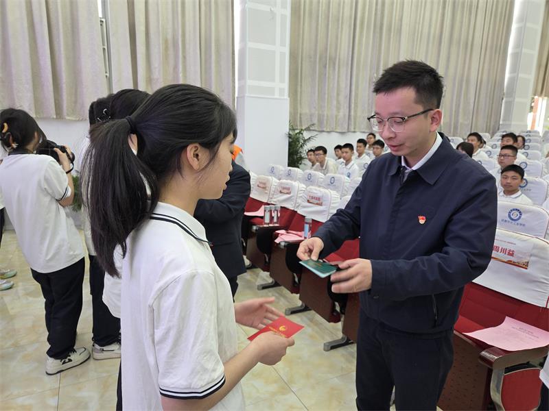 随后,学校党委委员、副校长蒙小建宣读新团员名单。在气势磅礴的团歌声中,党团组织负责人、企业代表及党员教师代表为新团员佩戴团徽、颁发团员证。在领誓人的带领下,全体新团员齐声宣读入团誓词,声音洪亮、誓言铿锵,彰显出坚定的理想信念。